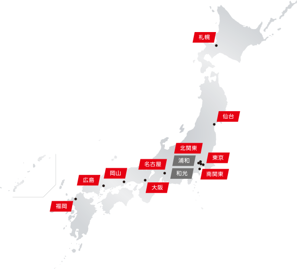 国内には、10の営業拠点をはじめ、最新鋭の設備のもとで製品の研究開発や製造を行う浦和工場、
