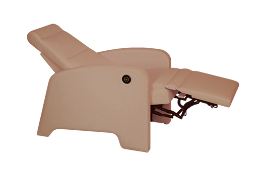 フットレストが先に上がり、その後に背もたれが倒れるワンモーター式リクライニングチェア。