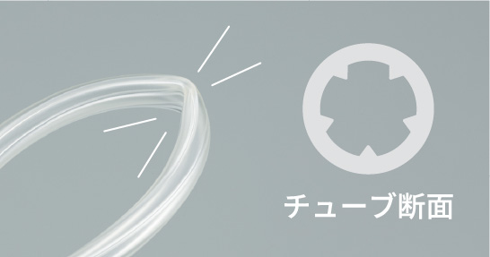 また、チューブが折れ曲がってもきちんと酸素が流れ続けるように、チューブ内側に独特な突起を設けています。この形状にたどり着くまで何度か試作を繰り返し、ようやく強く折れ曲がっても酸素が途絶えない構造のチューブが完成しました。